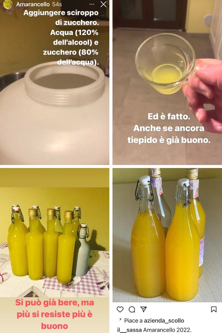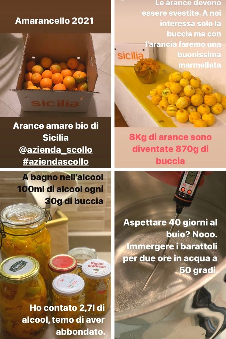 Pelare le arance evitando la parte bianca e pesare le bucce ottenute. Immergere le bucce nell’alcool alimentare e chiuderle bene in barattoli. La proporzione tra bucce e alcool è 100ml di alcool ogni 30 gr di bucce. Scaldare un pentolone di acqua e portarla a 50 gradi (io uso un termometro da cucina). Immergere i barattoli nell’acqua e chiudere con un coperchio e lasciarle per due ore. Nel frattempo preparare lo sciroppo con acqua e zucchero. La quantità di acqua e di zucchero dipende molto dal gusto personale di quanto lo si vuole alcolico e quanto dolce. Consiglio 1,2 litri d’acqua ogni litro di alcool e lo zucchero all’80% dell’acqua (800 grammi ogni litro). Se lo si vuole più alcolico si può mettere l’acqua uguale all’alcol. Se lo si vuole più dolce si può mettere lo zucchero uguale all’acqua (1Kg ogni litro).
